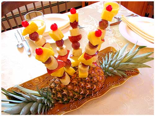 HINT: If you plan for a larger party, add more fruit so you will have one skewer per person. Other fruit could be watermelon, strawberries, melons, etc.
