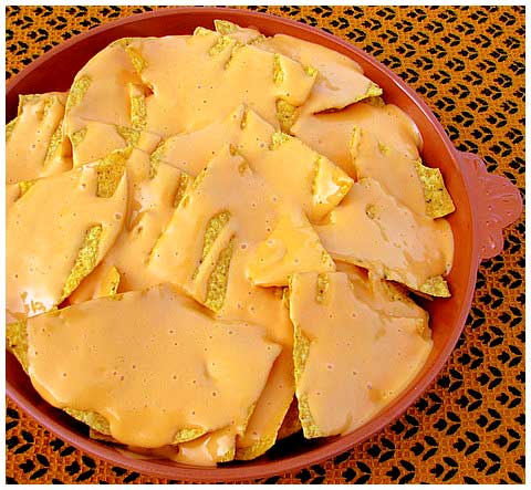 - Drizzle the cheese sauce [in recipe section] over the beans and chips and place in a hot oven just until they are warmed through.